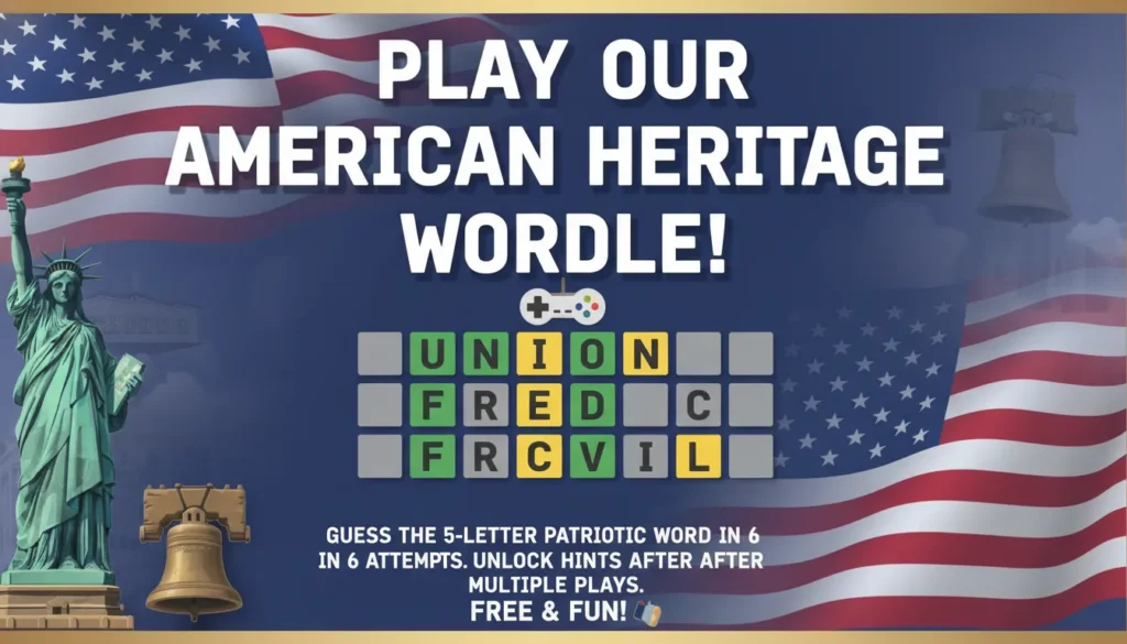 Play our American Heritage Wordle puzzle. Guess the 5-letter patriotic word in 6 attempts. Unlock hints after multiple plays. Free & fun! 🎮